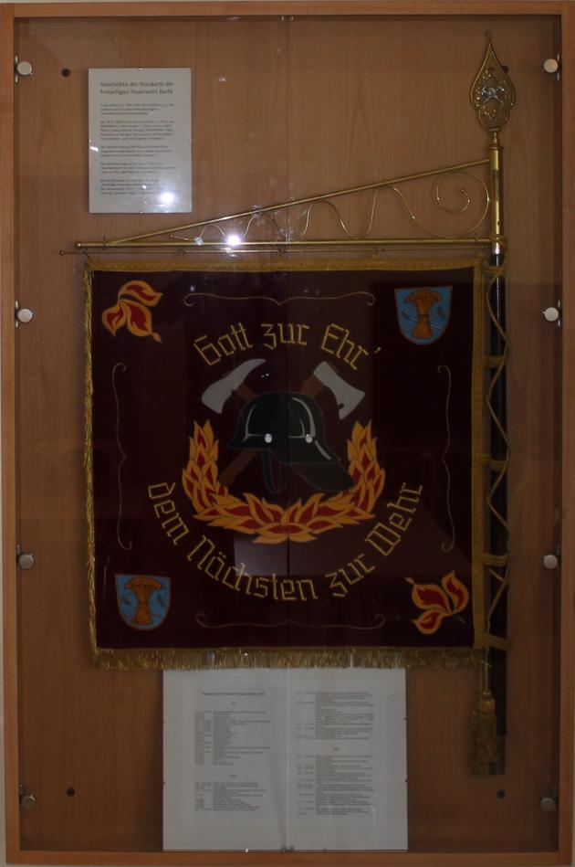 In den Jahren vor 1982 reifte der Entschluss, zur 700 Jahrfeier des Ortes Berfa eine eigene Feuerwehrstandarte anzuschaffen. Am 18.02.1982 fuhren Hans Kaufmann (1. Vorsitzender und Wehrführer), Hans Fenner (2. Vorsitzender und stellvertrender Wehrführer) sowie Heinrich Stumpf (Schriftführer) nach Karlsruhe zur dortigen Fahnenfabrik und bestellten eine Standarte nach ihren eigenen Vorgaben. Mit der Feuerwehrstandarte wurden zudem ein Jugendfeuerwehrwimpel, drei weiße Koppeln mit weißen Lederhandschuhen und drei weißen Helmen beschafft. Zu festlichen Umzügen und Feierlichkeiten konnte dann die Feuerwehr durch Standarte und Koppeln, Handschuhen und Helmen in weiß präsentiert werden. Unsere Standarte wurde sicher und gut geschützt im Gerätehaus verwahrt doch kam sie leider nicht so zur Geltung wie sie es verdient hatte. Nach einem Vorschlag und Beschluss im Jahr 2020 wurde dann in 2021 eine Vitrine für die Standarte gefertigt. Heute freuen wir uns darüber die Standarte im Gerätehaus so verwahren zu können wie wir es für angemessen halten. Gut geschützt, würdig präsentiert und doch für den nächsten festlichen Einsatz griffbereit. Die Standarte zeigt auf der einen Seite einen Feuerwehrhelm mit dem Leitspruch der Feuerwehren „Gott zur Ehr, dem Nächsten zur Wehr“. Auf der anderen Seite ist unter dem Schriftzug „Freiwillige Feuerwehr Berfa“ unsere Kirche mit den Jahreszahlen 1952 und 1982 abgebildet.