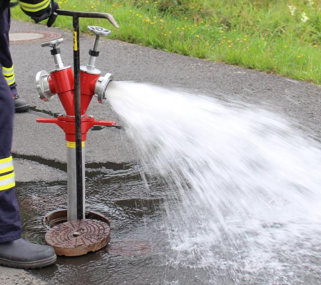 Auf unserem Bild, aus dem Archiv vergangener Übungen, sehen wir wie ein Kamerad einen Unterflurhydranten vor seinem Einsatz spült und auf diesem Weg Verunreinigungen des Trinkwassers verhindert.