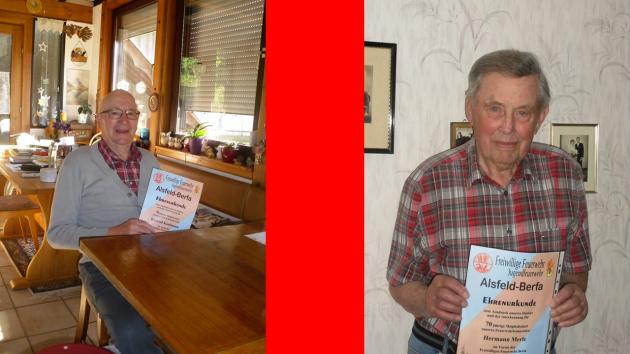 Bereits seit Gründung und damit seit über70 Jahren sind Konrad Kaufmann und Hermann Merle in der Freiwilligen Feuerwehr Berfa , anfangs als aktive Feuerwehrleute und in späteren Jahren als unterstützende Mitglieder.
