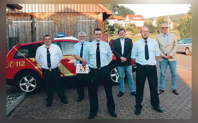[Bild v.l.n.r: 1. stellv. SBI Carsten Schmidt, 1. Vorsitzender Ottmar Weiß, stellv. Wehrführer Oliver Martin, Stadtrat Rolf-Peter Stein, Wehrführer Björn Plumhoff, Stadtverordnetenvorsteher Michael Refflinghaus]